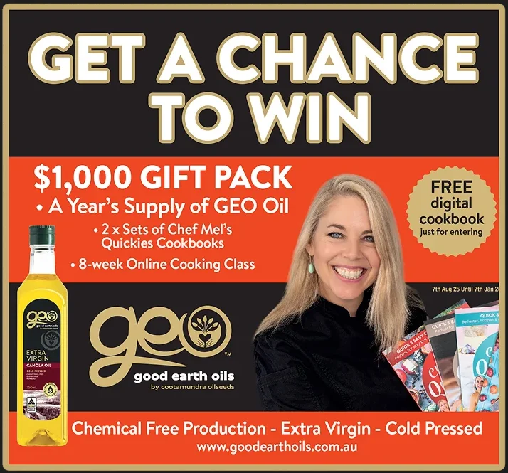 1. Promoter The promoter is Good Earth Oils located at 2/100 Park Road Slacks Creek, QLD 4127, Australia 2. Eligibility Entry is open to Australian residents aged 18 years or over. Employees of the promoter and their immediate families are not eligible to enter. 3. Promotion Period The competition starts on 25th August 2025 and ends at 5:00pm (local time) on 31st Devember 2025. Entries received outside this period will not be accepted. 4. How to Enter To enter, customers must purchase in-store a Good Earth Oil product during the promotion period, visit the Good Earth Oil website and subscribe now on the landing page for a change to win the prize. 5. Prize The prize is a $1,000 gift basket inclusive of 12-months of GEO canola cooking oil (30x bottles $253.00) plus a 2x complete printed sets (12x books) of Chefs Mel’s (The Happy Chef) cook-book collection valued at ($350.00) Plus Eat Yourself Sexy Cooking & Mindset Challenge Online Cooking Course Valued at ($397) The total prize value is AUD $1,000.00. 6. Winner Selection The winner will be drawn at random on 3rd January, 2026. The winner will be notified by phone/email within 2 business days and announced on our social media pages. 7. Prize Conditions The prize is not transferable or redeemable for cash. If the prize is unavailable for any reason, the promoter reserves the right to substitute a prize of equal or greater value. 8. Privacy By entering, you agree to the use of your name and contact details for the purpose of this competition and future marketing by the promoters, unless you opt out. 9. General The promoter reserves the right to disqualify any entrant who tampers with the entry process or submits an entry not in accordance with these terms.
